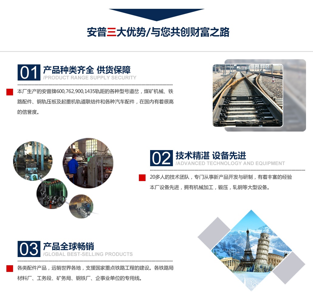 关于我们林州市安普工矿器材厂生产的安普牌600,762,900,1435轨距的各种型号道岔,煤矿机械、铁路配件、钢轨压板及起重机轨道联结件和各种汽车配件,在国内有着很高的信誉度。本厂有20多人专门从事新产品开发与研制的小组,有着多年的生产经验与历史,我厂铁路产品主要有各种型号的轻、重轨道岔。线路配件有螺旋道钉、扣板、铁座、普通拉杆、绝缘拉杆、鱼尾螺栓、防爬器、垫板、桥梁护轨配件等品种。吊车轨道联结件有各种型号的压板、罗栓、胶垫、焊接式压轨器等品种。煤矿配件主要有:液压支柱、金属支柱、铰接顶梁各种零部件、顶盖、底座、手把体、活塞、水平楔、滑块、楔块、1050型的水平楔、垂直楔、传动楔、(A、B型)接头左右耳、调角楔、档圈、及各种锻件、机械加工产品。汽车配件主要产品有各种差速器壳、减速器壳、轮壳、制动器系列产品。产品远销世界各地,支援铁路工程的建设。各铁路局材料厂、工务段、矿务局、钢铁厂、企业和单位的专用线。行车配件涉及...